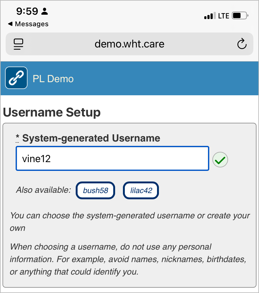 Follow the instructions on the screen to accept a system-generated username or create your own. Below, an onboarding member was given the system-generated username, vine12. The member chose their own username and entered sunsetfox into the username field.