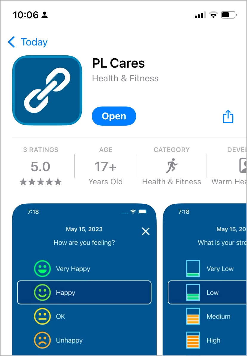 Depending on your phone type, you will see a link to the appropriate store to download and install PL Cares. Tap the link to go to the store, then tap open or install to download and install PL Cares.
