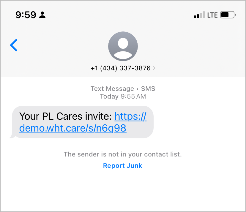 Look in your texts for the PL Cares invite link. Tap the link to set up your account.