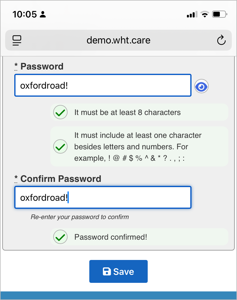 When the password has been entered and confirmed and the three green checkmarks are showing, tap Save to finish the account setup.