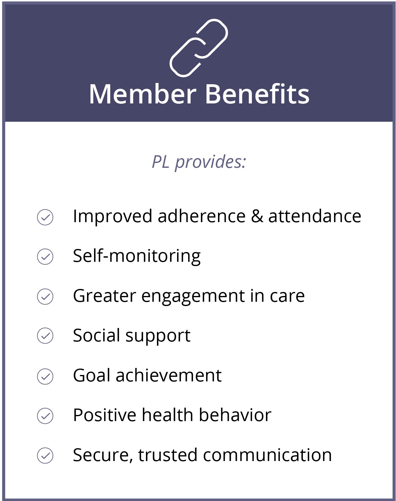 Use of the PL smartphone app is associated with improved appointment adherence and patient outcomes. Click each card for .pdf files you can view or print to learn more about the benefits of PL Cares